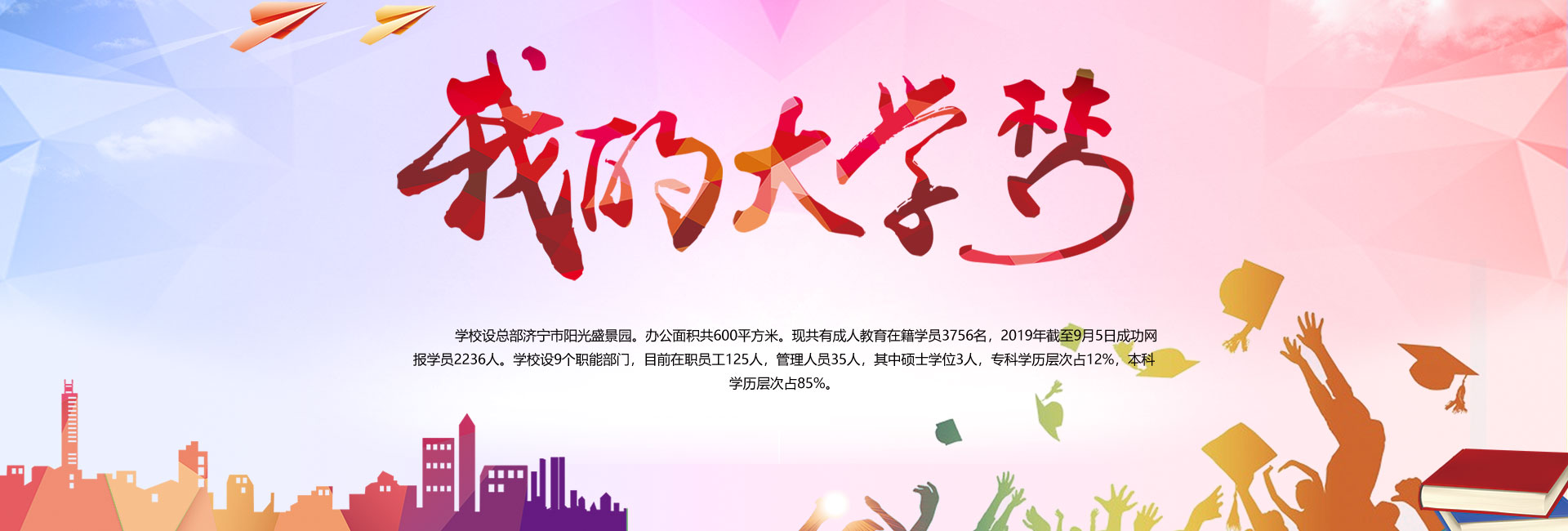学校设总部济宁市阳光盛景园。办公面积共600平方米。现共有成人教育在籍学员20000多名,2022年9月成功网报学员5000人。学校设9个职能部门,目前在职员工200余人,管理人员35人,其中硕士学位3人,专科学历层次占12%,本科学历层次占85%。