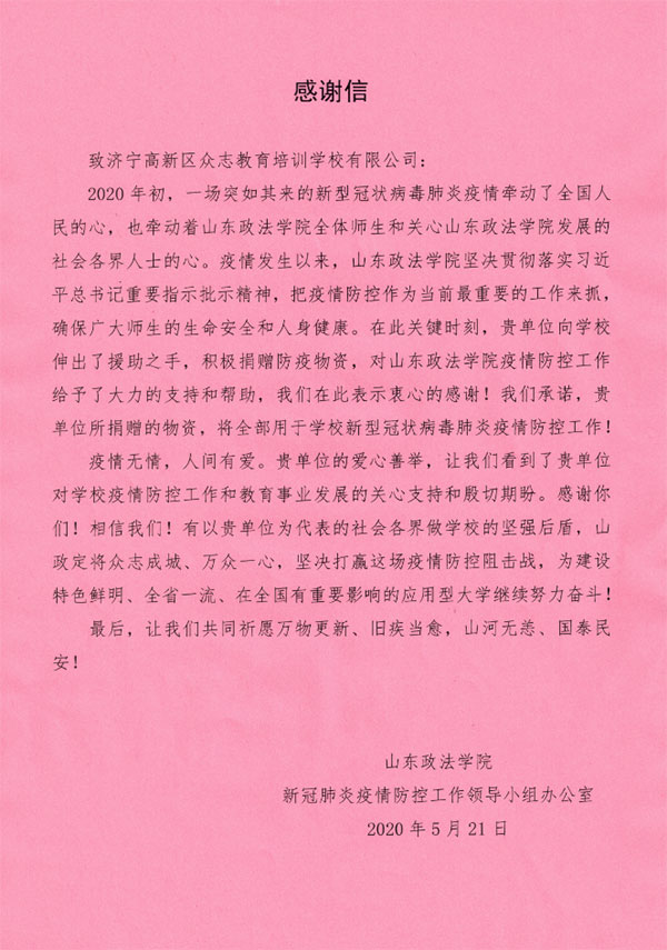共克时艰 共促发展 亿万28 教育培训学校向山东政法学院捐赠防疫物品